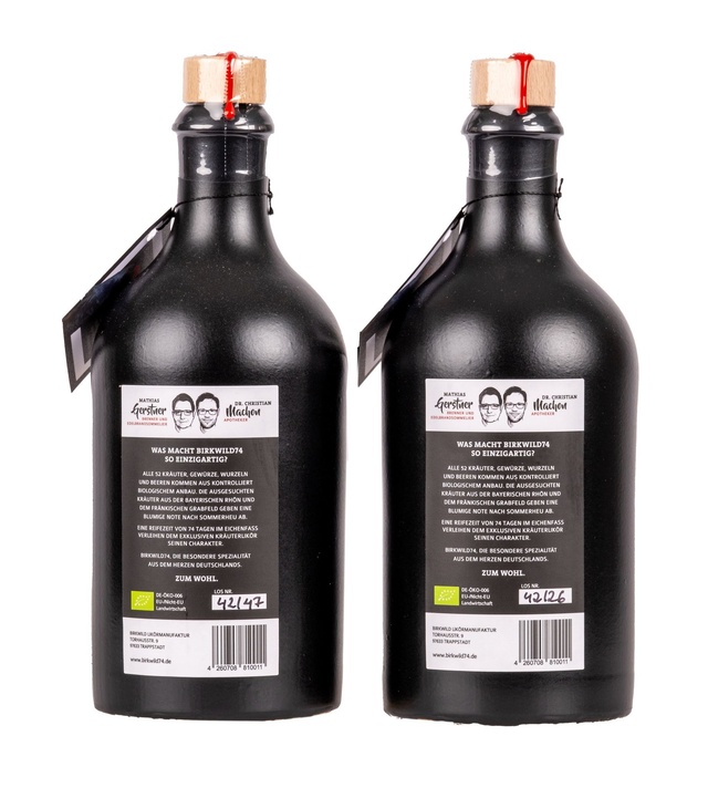 Unser einzigartiger Bio Kräuterlikör wird aus 52 Kräutern, Wurzeln, Beeren und Blüten in aufwendiger Handarbeit gefertigt. Die Ausgesuchten Zutaten geben einen kräftige Kräuternote und einen Duft nach Sommerheu ab. Quellfrisches Wasser aus der Rhön und eine Reifezeit von 74 Tagen im fränkischen Eichenholzfass runden den exklusiven Kräuterlikör ab. Birkwild74 entstand aus einer Zusammenarbeit vom Brenner und Edelbrandsommelier Mathias Gerstner und dem Apotheker Dr. Christian Machon.